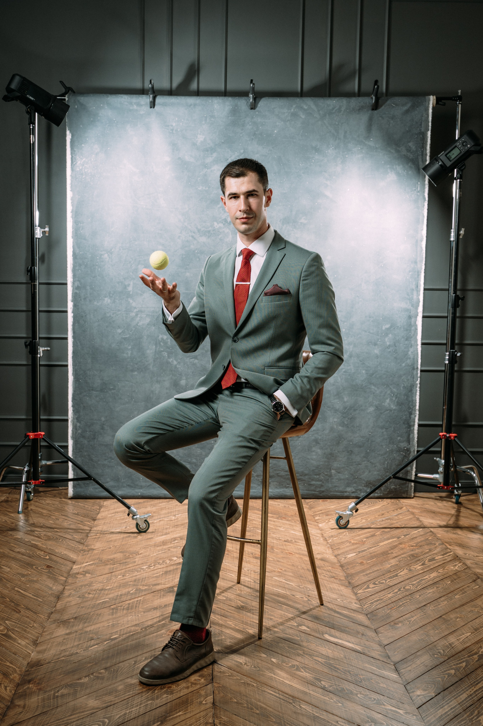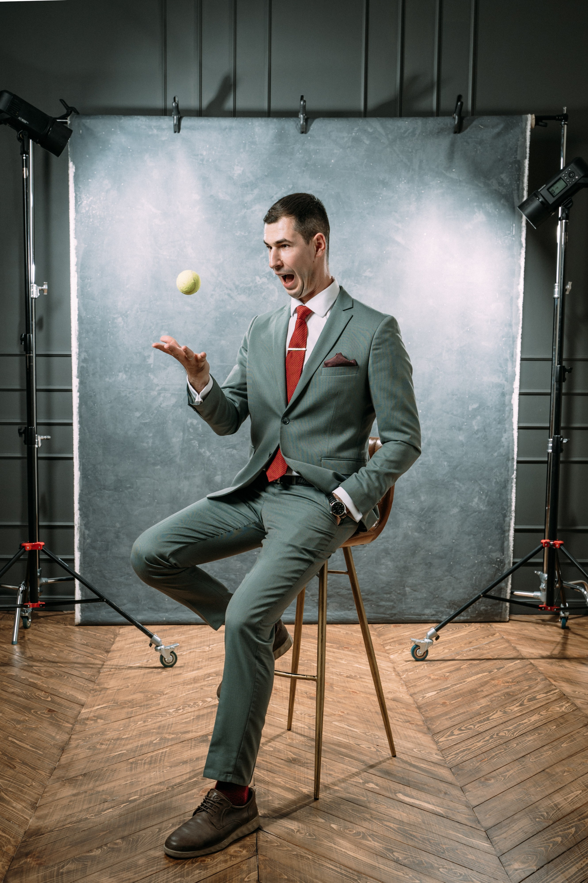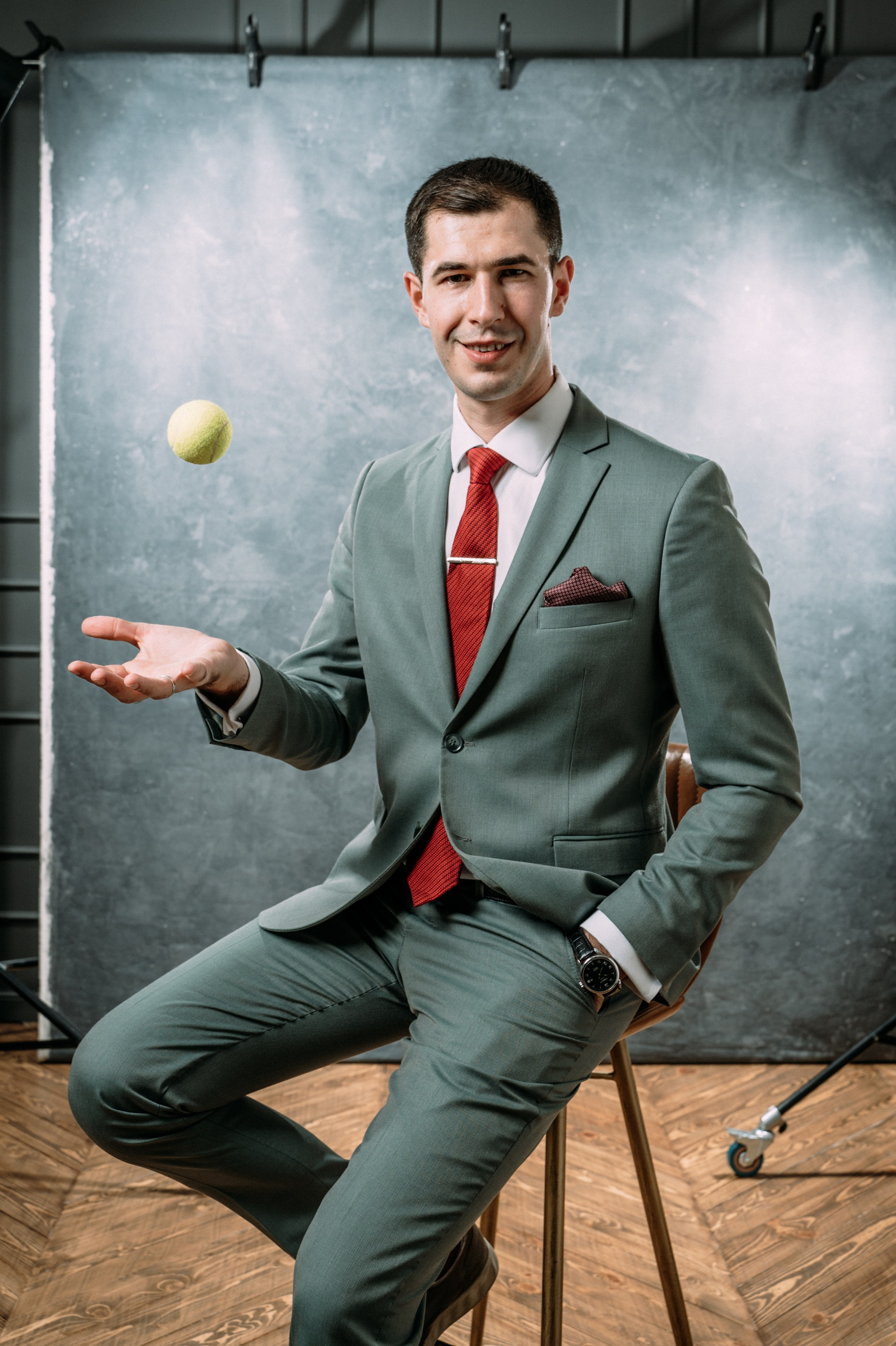 Так как Адиль является спортивным комментатором, в одном из образов мы решили применить спортивный реквизит, чтобы подчеркнуть эту часть его деятельности.